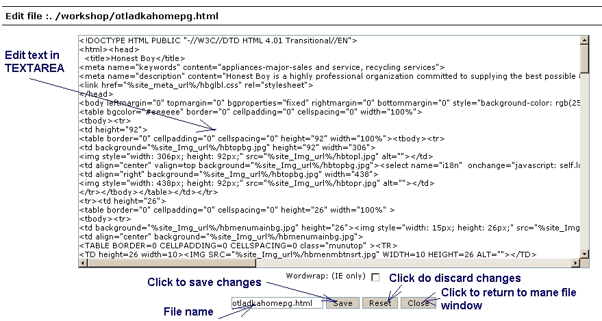 в текст и соранить изменения (нажать кнопку ‘Save’). Для возвращения в